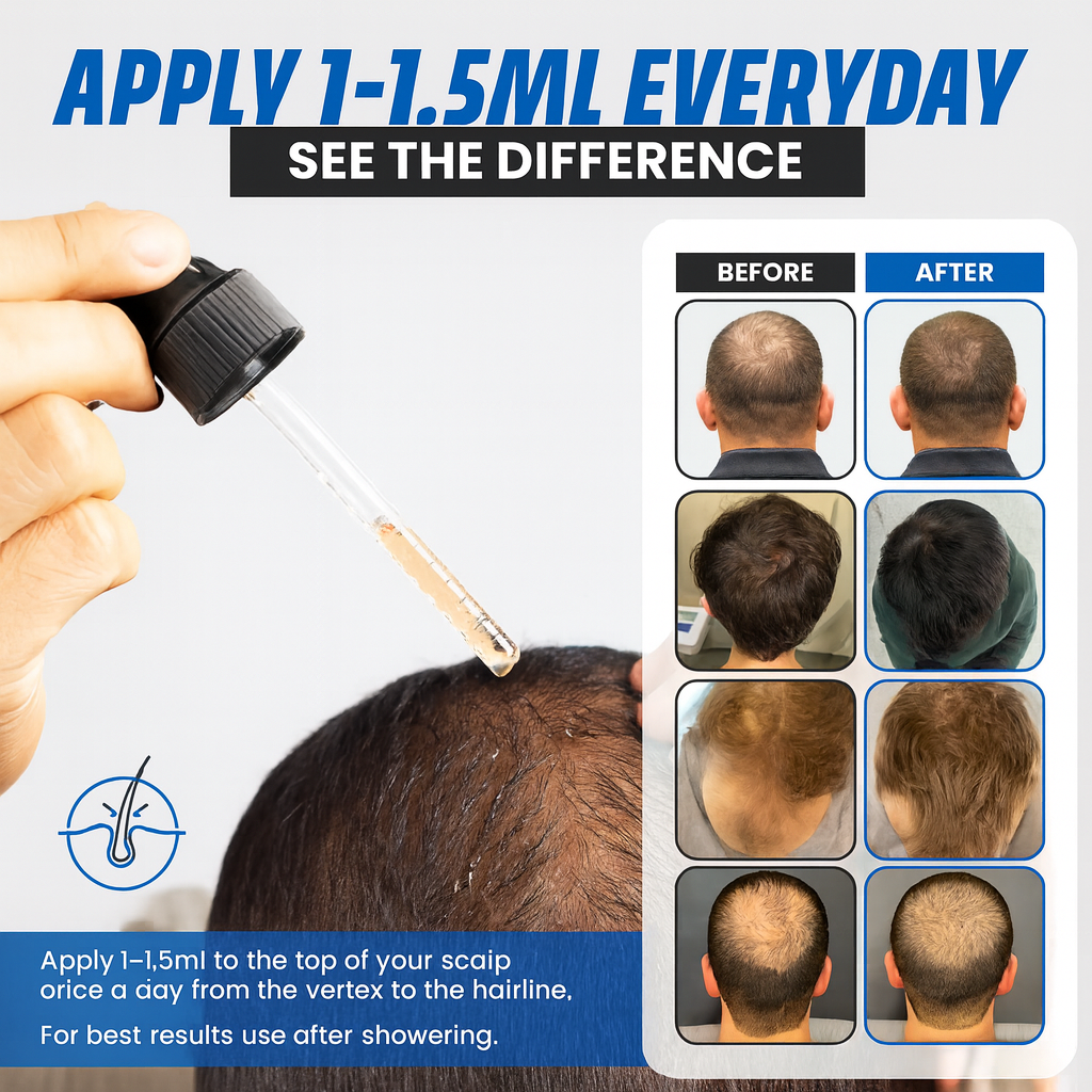 No harsh shedding phase like finasteride or minoxidil. Some mild early shedding can occur as weaker hairs are replaced by stronger ones, but it’s temporary — a natural sign that follicles are reactivating and transitioning back to the growth phase