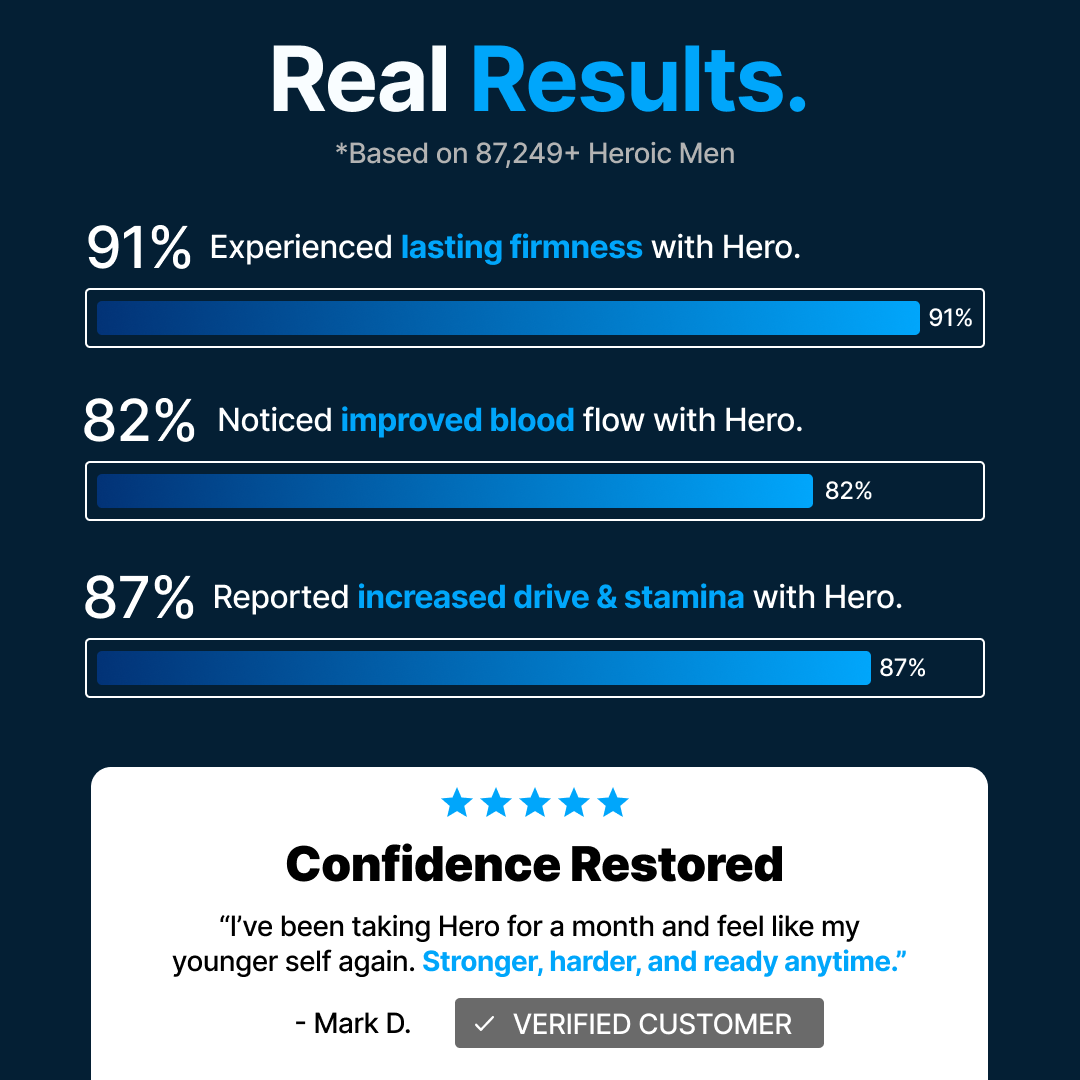 HERO combines 9 research-backed ingredients that naturally support testosterone levels, blood flow, and libido. This powerful formula helps increase nitric oxide, reduce cortisol, and restore hormonal balance — key drivers of energy, mood, and performance. Unlike harsh pharmaceuticals, HERO works with your body to reignite the spark and confidence you’ve been missing.